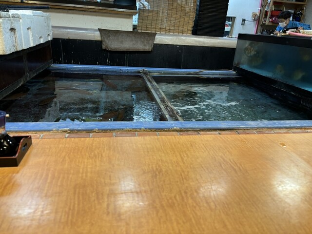 カウンター席に案内された。カウンター席の前は大きな生簀や水槽。