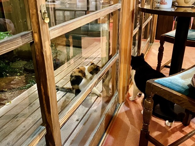 外観は英国風、中に入ると古民家風、庭には木々が生い茂っており、木漏れ日感が心地よく、鳥の囀りやそよそよと吹く風がとても気持ちが良いです。