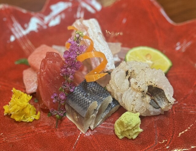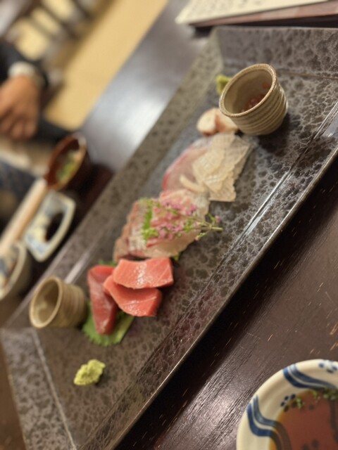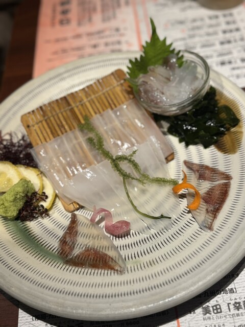 刺身は鮪赤身、中トロ、鯛、ヤリイカ、関サバ? 九州北部近海で獲れた刺身はどれも新鮮で美味しい。