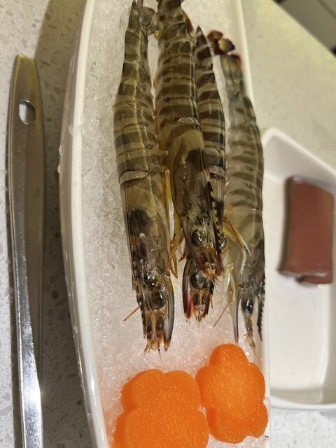 写真に写っている4匹のクルマエビ(天然のではありません)は生きていますが、活動的ではありません。4匹で1000円以上もします。近くの中国街で3500円で500g(少なくとも30匹)を買うことができます。調理法はすべて同じで、沸騰したお湯で3分間煮ます。このエビを食べるときは、ソースをつけずに食べます。海底捞で食べる必要はありません。