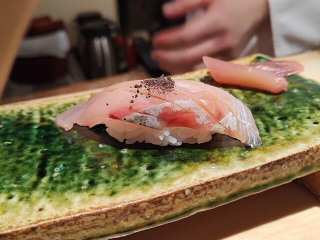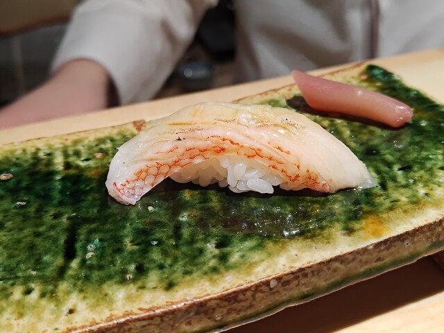 「鮨ノ蔵」のスペシャリテが初めから登場。細かな包丁を入れた上で半田ゴテで炙るという独特な仕事。全体は生のままなのに、煮切り醤油の香ばしい香りが立ち、味のコントラストが印象的。