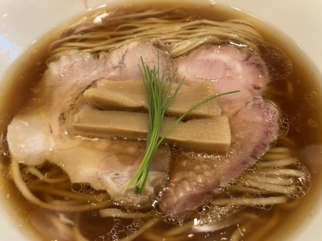 オーダーしたのは一番シンプルな鶏そば(1,150円)。澄んだ鶏ベースの醤油ラーメンで、麺は中太、チャーシューが2種類乗っています。