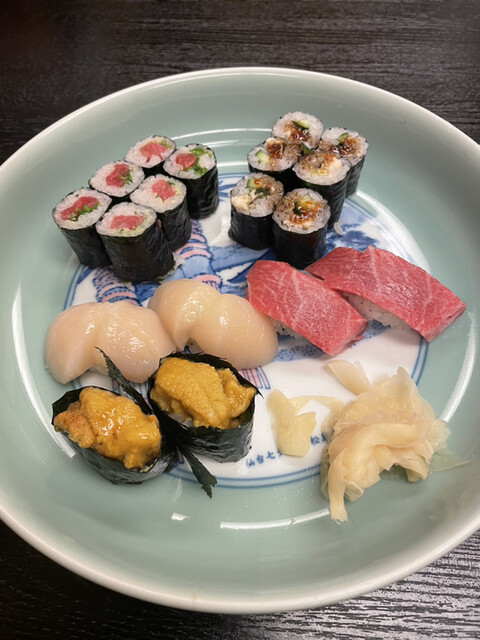 お寿司は、ネギトロ、あなご、トロ、うに、ホタテと、どれも、ネタが新鮮で口に入れるとぱらりとほぐれる美味お寿司。ネギトロが、トロの切り身を使ったネギトロ美味。(≧∀≦)