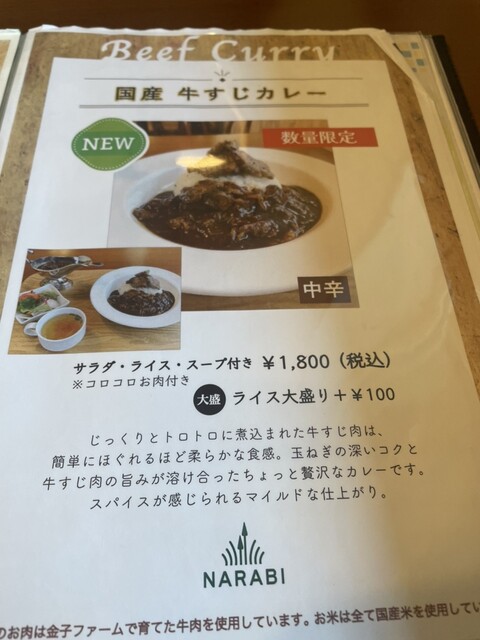 先にサーブしたのはカレー、5mm以上、10mm以下の多分ミスジのお肉が三枚、そしてみてすぐわかる。とろっっトロにほぐれたスジ肉、スプーンですくって一口、うん最初に旨みが来て、後から香辛料の香りがややくる、辛みはほとんどない欧風カレー、しかし、牛肉の旨みたっぷり、溶けたスジ肉がさらに旨みを増す。とっても美味しい。数量限定だけあるわぁ。どちらかというと、ハヤシライスに近いかも〜。