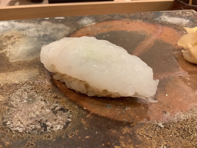 コハダ:大きな身を2尾づけです。間にオボロを咬ませています。