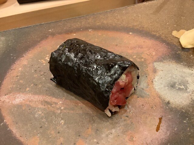 巻物:ここでマグロの巻物です。なんと山ワサビを入れます( ゚д゚)