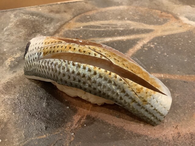カマス:皮目も炙ってから握ります。