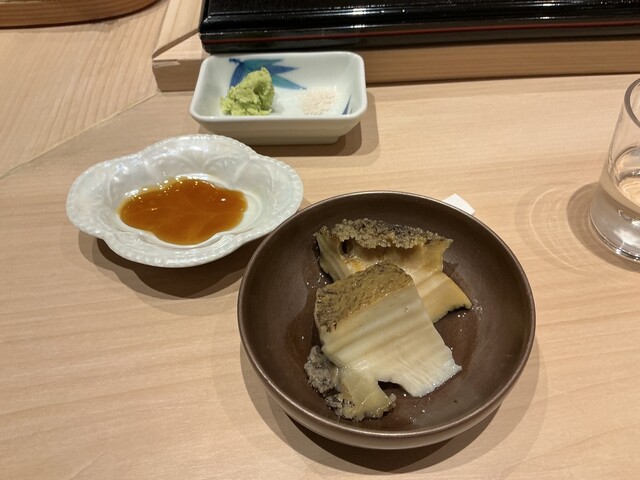 クエ:炙った熊本の30キロのクエにスッポン出汁の煮凝りをかけてあります。