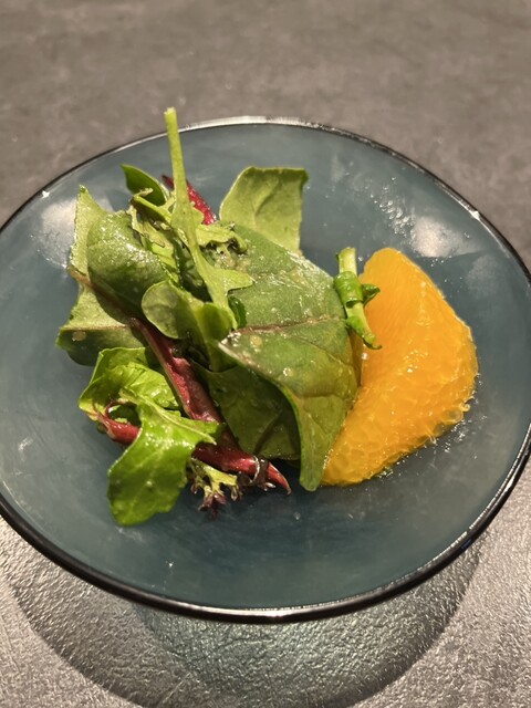 コース後半のリセットにぴったりな、瑞々しく清々しい野菜のサラダ。酸味がきりっと効いて、次の料理へ自然に橋渡ししてくれました。