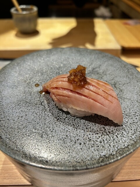 握りは、まぐろの脳天から。脂の甘みとシャリの温度感が合い、コースの中でも記憶に残る一貫。金目鯛は上品な脂、塩じめのあじは旨味が凝縮され、仕事の丁寧さが際立つ。