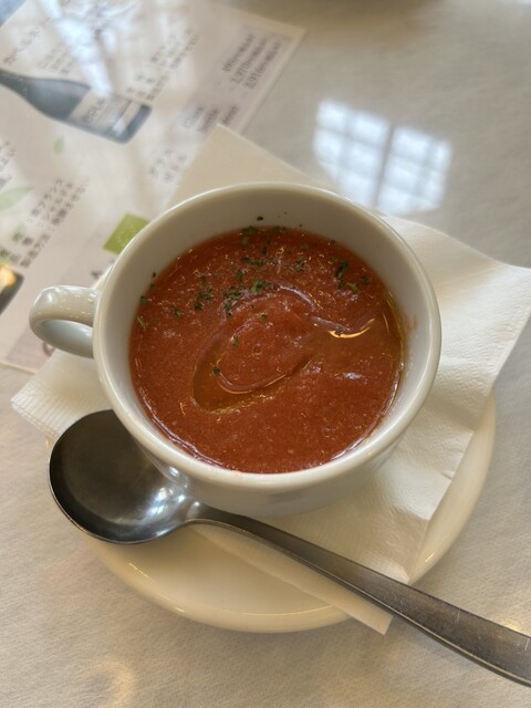 注文週末ランチと単品で、➕100円で本日のスープが頼めるので、注文この日はガスパチョでした