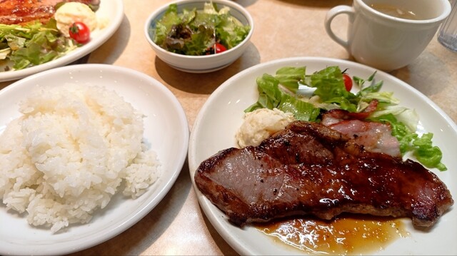 おすすめのステーキ定食を平日ランチに注文しました。13時前で並ぶことなく入店。1,080円という価格にあまり期待していませんでしたが、肉は大きくミディアムレアで柔らかく、ポテサラも豚汁もついてきてとても美味しかったです。日替わりランチはなんと600円で、いずれの定食にもドリンクバーがつき、ごはん大盛り無料です。恐るべしコスパです。