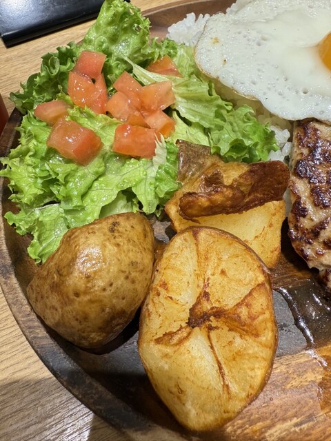 ワンプレートは、見た目がボリューム感ありますが、やはり満腹感満足〜♪ポテトが一個有りますね〜皮付きポテトは、素揚げでしょうか軽く塩味