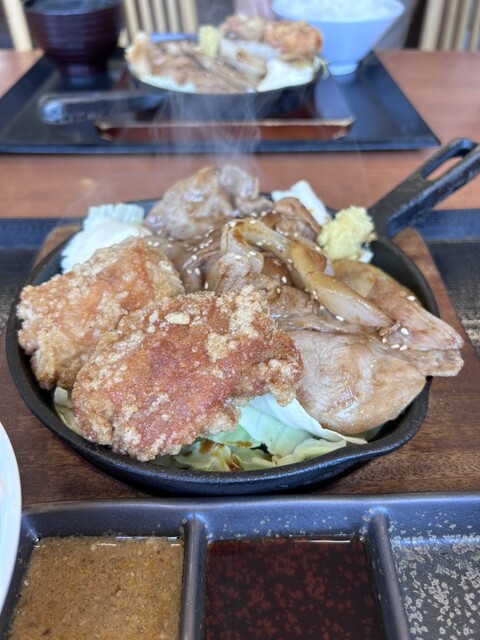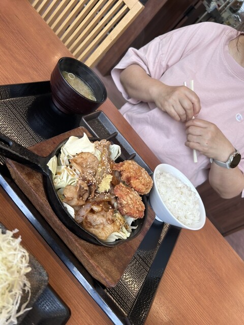 今日は、徒歩なので、入店、1番奥の34番テーブルへ座り、からあげ生姜焼きの合盛定食1067円を注文!安定の旨さ!鉄板焼きのキャベツ、玉ねぎがアツアツで、これまた旨し!