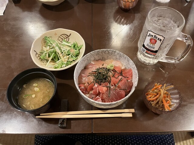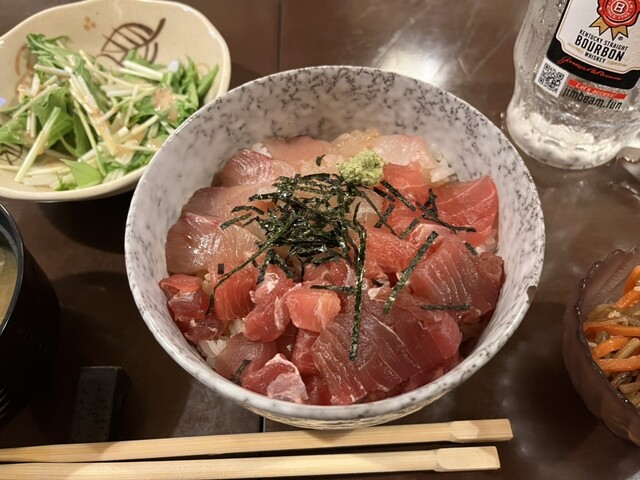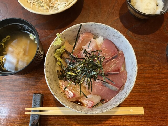 仕事昼飯。㐂楽さんでワンコイン海鮮丼ランチを今日はマグロ、ハマチなど三種蓮根小鉢、キャベツサラダもついてワンコイン美味しかったですー〜ごちそうさまでした