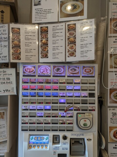 店の入口に、各種メニューが貼り出されており、そこで何にしようか迷いながら、店内入口の券売機で食券を購入して着席します。メニューが多いので迷いましたが、はやり初訪問なので左上の『#特製ラーメン煮干 』を選択しました。