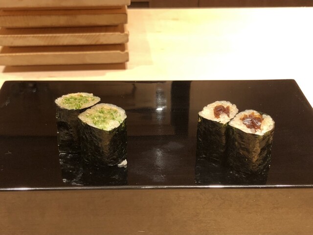 ウニの余韻を堪能しつつ、穴子の塩・タレのハーフ2貫と巻物2種を。
