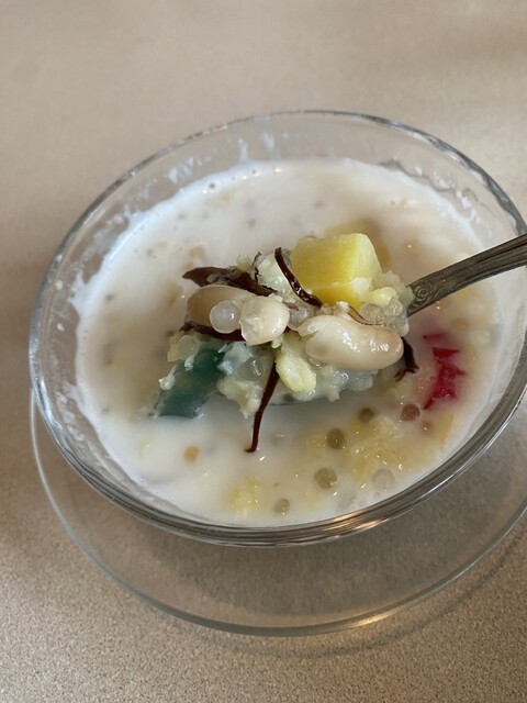 白いんげん、さつまいも、塩昆布、タピオカなど。温かいぜんざい。冷房が凄く効いているので、温かいぜんざいが丁度いい。ほのかに甘い。くどくなく優しい味わい。