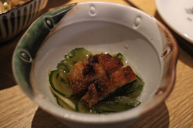 まずはそのまま一口、香ばしさとスモーキーな炭の香りが広がり、肝のほろ苦いコクが至福のアクセントに。卵黄を絡めるとまろやかさが加わり、濃厚ながら後味は優しく、最後まで飽きずに楽しめます。だし巻きやうざく、香の物、吸い物がセットになり、見た目にも満足感たっぷりの一品です。