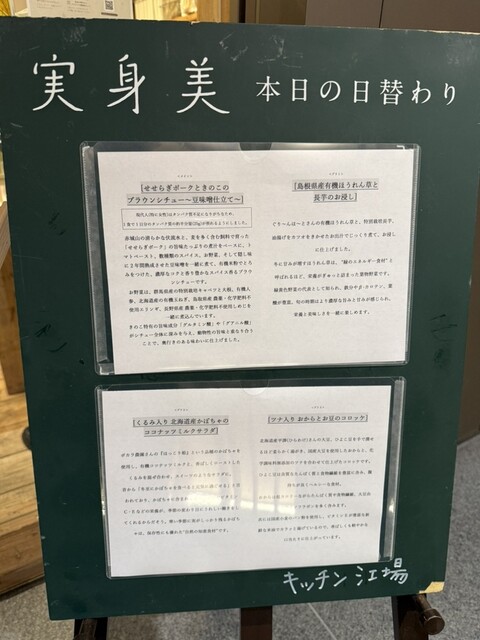 リモートワークで少し身体が疲れてきたなと感じていたとき、「身体に優しいごはん」で検索して見つけたのが、実身美さんでした!大手町駅直結でアクセスも良いから、仕事の合間のランチにピッタリ。お店のコンセプトが「実があって、身体に良くて、美しい」というところに惹かれて、期待感を胸に訪問しました✨。地下に降りた先に広がる、明るくて落ち着いた空間に、都会の喧騒を忘れてホッと一息つけました。