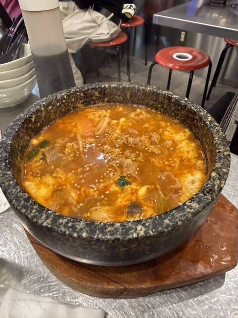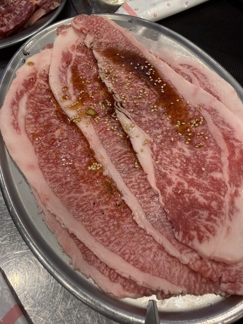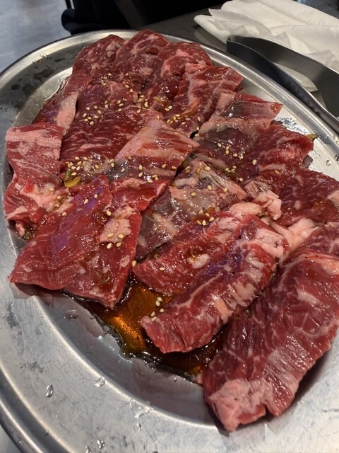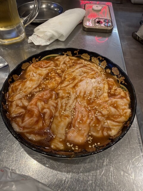 まずはスピードメニュー!特にもやしナムルは絶妙な味付けで、量もたっぷりで食べ応え抜群。そして、丁寧な処理がされたもつ刺し(多分、タン刺しやレバー刺し)は、プリッとした食感で鮮度バツグン!。レモンとネギでさっぱりと食べられて、いきなり感動レベルのおいしさでした