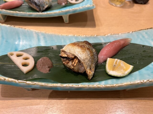 ふわっとした触感の柔らかい秋刀魚と風味豊かな松茸のしゃきっとした触感がいい塩梅です。横に添えられている肝も美味でした。