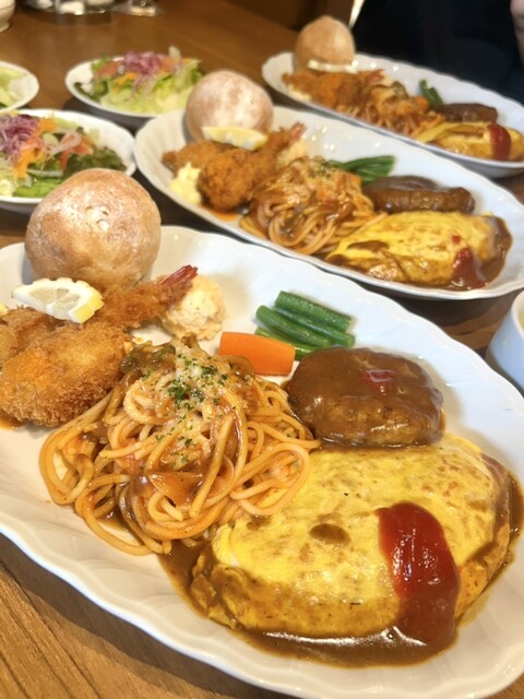 オムライス、ハンバーグ、ナポリタン、エビフライ、カニクリが乗ってるよ!一つ一つがほんと美味しいサラダとスープ、ドリンクまでついてこの価格は良かった!