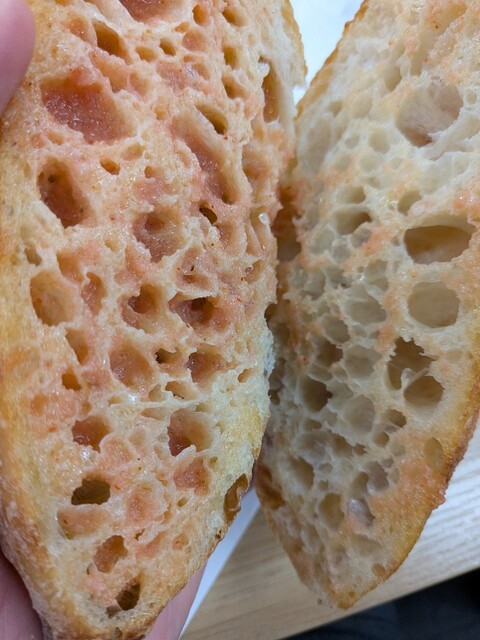 じゅわ〜っと、広がるバターの風味と明太子の旨味とピリ辛感が押し寄せる。さらにピリッとする胡椒のアクセントが味を引き締める〜。