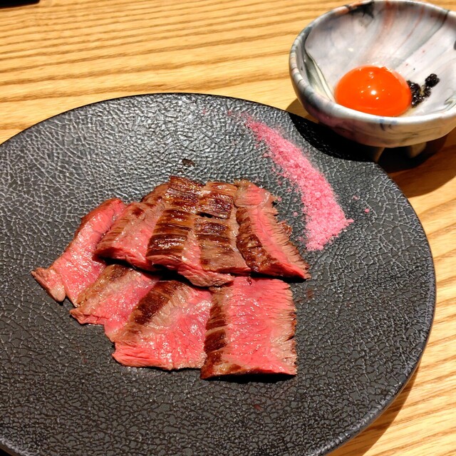 名物のはらみステーキは、卵黄トリュフを絡めたり、ワイン塩やわさびで味の変化を楽しめたりと、工夫が凝らされています。
