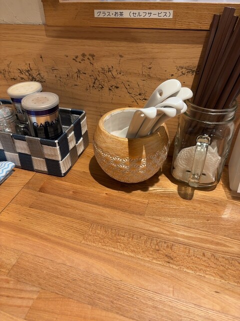 お店入って左手に券売機。中央あたりにお茶の給茶機(ジャスミン茶⁇)あり。卓上に水ポットとティッシュあり。カウンター下に荷物用の棚あり。荷物カゴもあり。ゴミ箱は壁側に何ヶ所かあり。