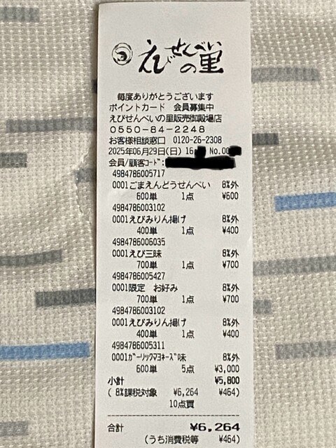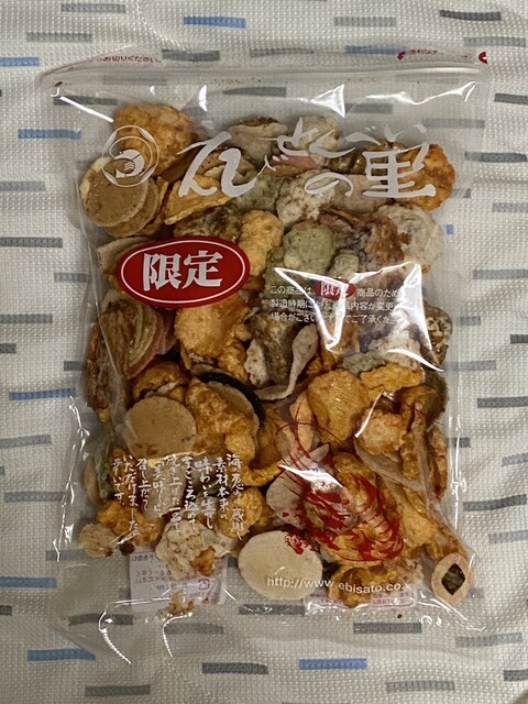 自身は「ガーリックマヨネーズ」×5個だけでは納まらず、結局「えびみりん揚げ」×2個、「えび三昧」「ごまえんどうせんべい」「限定 えびせんいろいろ(お好み)」をそれぞれ1個ずつ購入。