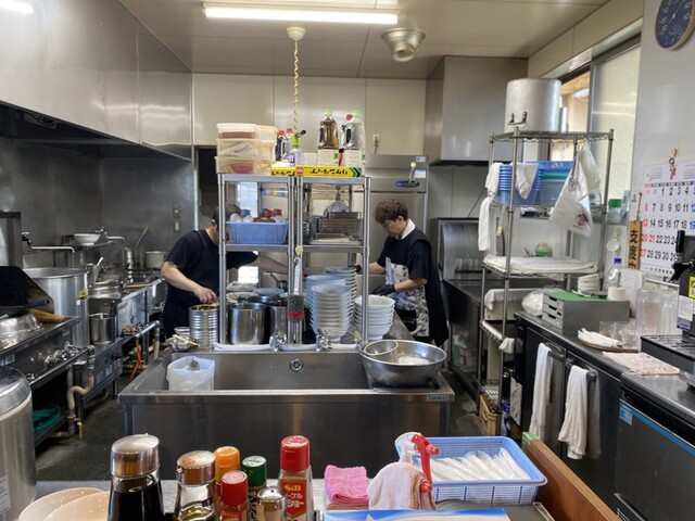 厨房では店主らしき男性がほぼ1人で、チャーハンやらラーメンを調理。3人で切り盛りしていて、見た感じ身内で経営している様子。サポート的に女性店員さんが焼豚を炙ったりしているのが見えた。もう1人女性店員さんが居て、接客担当といった様子。