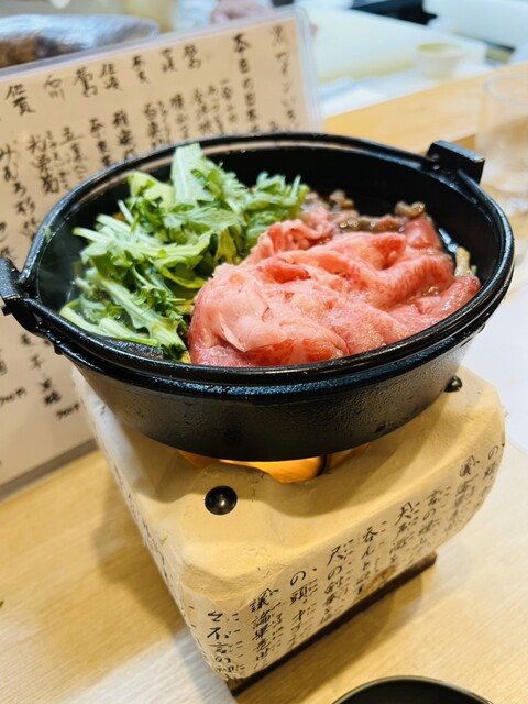 暑気払いで行っちゃいました。 暑気払いなのですき焼きとハリハリ鍋と季節的に白エビもも足してもらいました。 とても良かったです。 魚のみならず鯨含めお肉も頂けるのがポイントですね。 焼酎がお料理によく合いました♪