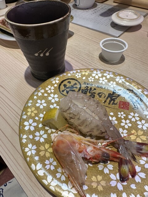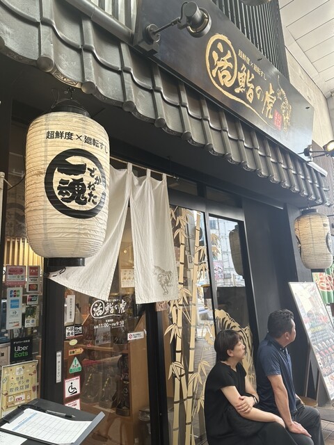待望の「超鮮度×廻転すし 活鮨の虎」さん。入り口前で記名・待機。土曜18時少し前、20分位で入店できました。