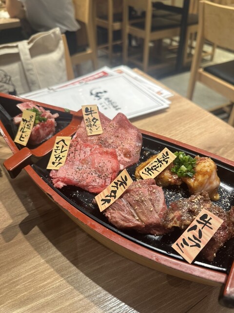 □舟盛り2(黒塩カルビ・牛タン塩焼き・牛ハラミ・弘ホルモン(ホソ)・ネクタイ・ヘレエンガワ)