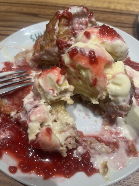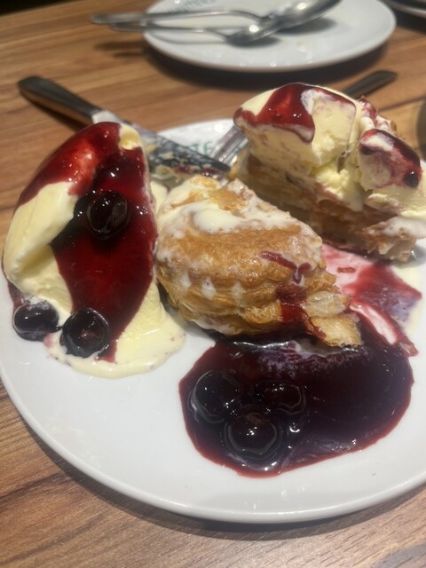 デザートには名物アップルパイアラモードを選び、ラズベリーとブルーベリーで華やかに。デザートとは思えないボリュームで腹パンになりました笑