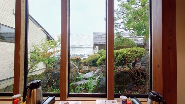 カウンター席から外の庭園を眺めながら待っていましたが、外は雨ですね。
