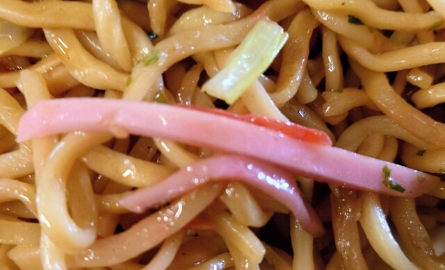 キャベツ、細切り魚肉ソーセージ、錦糸玉子に青のり。他とは違い、紅しょうがも一緒に炒められています。