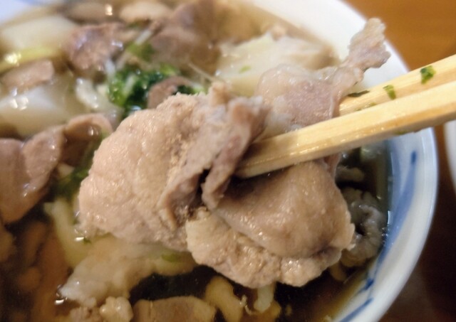 あっさり醤油スープにこんにゃく、ネギ、牛肉が入り、最後に青のりがふってあります。