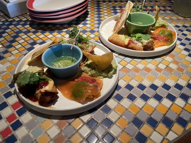 前菜はサーモンやアボカドチップスがあり、チーズが挟まれた生地に蜂蜜をつけて食べるのが美味しかったです。赤いソースは結構辛めでした。