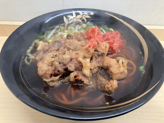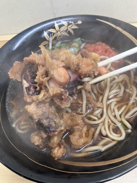 東京駅八重洲中央口から徒歩15分、『そばのスエヒロ』にて、並盛り+ジャンボゲソ+紅生姜天ハーフ(計710円)をいただきました。