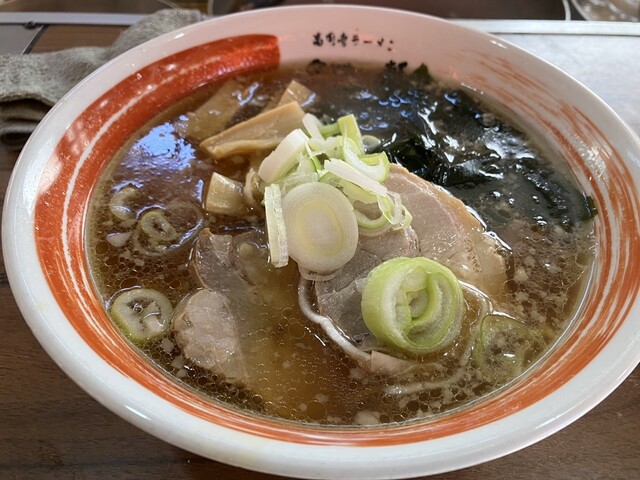 麺盤は、チャーシュー2枚、ワカメ、メンマ、長ネギ、背脂少々の構成。