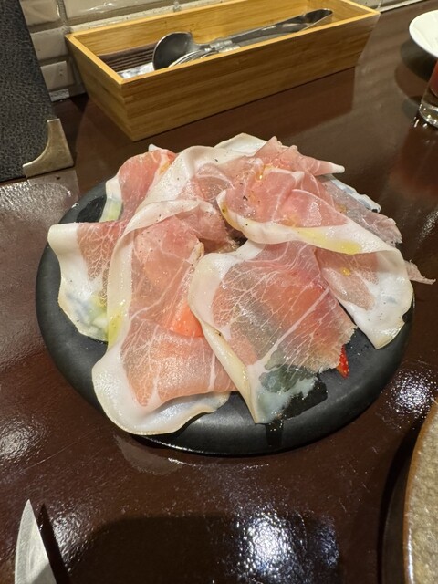 生ハムとフルーツ。この日はいちごと。いちご酸味甘味と生ハムがかなり合います。けっこうなボリューム。