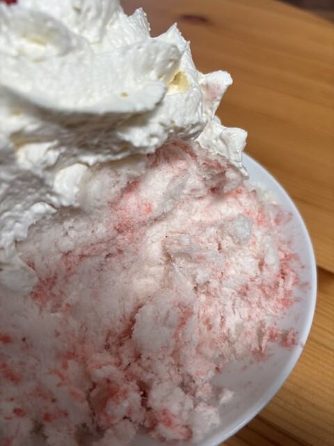 なるほど、やはり噂通り、味わったことのない食感。口の中に入れるとすぐに溶けるのではなく、いったんまとまり、それからアイスクリームのようになって溶けていく感じである。また、通常のかき氷のように頭が痛くなることは一切ない。すごいものだ。とことん水にこだわったかき氷らしいが、水が違うだけで、ここまで食感が変わるのだろうか?製氷過程でなにかしらの化学物質が混入されているのではないかと疑ってしまうほど、不思議な氷の食感である。