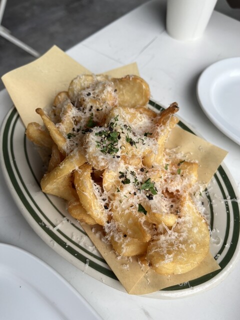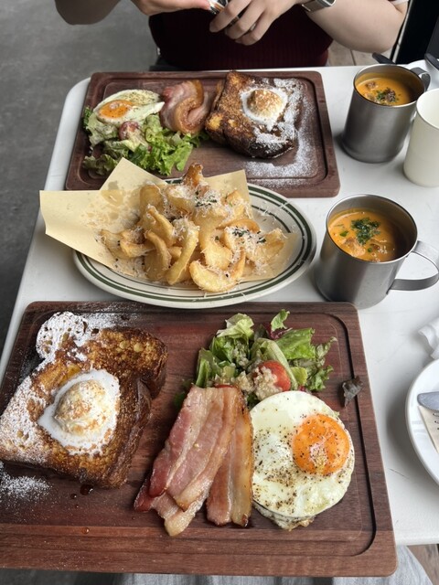 今回は店内のメニューが食べたかったので店内へ。フレンチトーストとサラダ、ベーコン、エッグ、スープがついたプレートに食べたくなったカリカリポテト(チーズかけ)を頼みました。他にも魅力的なメニューがたくさんあって困りました。