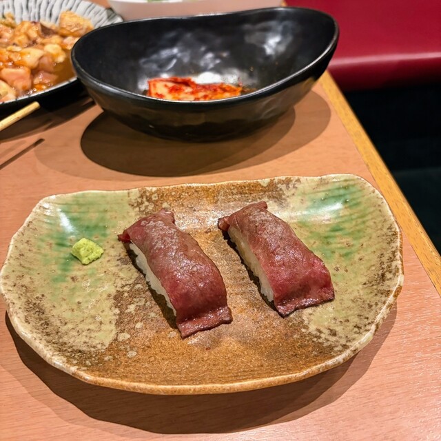 肉寿司は皿までアツアツでうまい