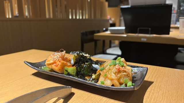 キムチの盛り合わせは白菜キムチがしっかり漬かっていて辛味と旨味がちょうどいい。チョレギサラダは海苔たっぷりでドレッシングも濃厚、野菜が美味しい。