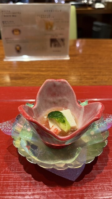 先付の蕪羅豆腐と寄せ湯葉に蟹が入っていて、蕪霙ジュレと合わせると上品で繊細な味わい。口当たりが滑らかで素晴らしい。