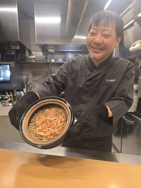 焼き物は朴葉みそ、続く揚げ物は白子の天ぷらを馬鈴薯のスープ仕立てでいただく、創意工夫を感じる仕上がり。中皿には活け松葉蟹の塩茹で、強肴には鮑のステーキと、後半も贅沢感が続きます。食事は桜えびの炊き込みご飯、デザートは栗のブリュレと季節感のある締めくくりでした。