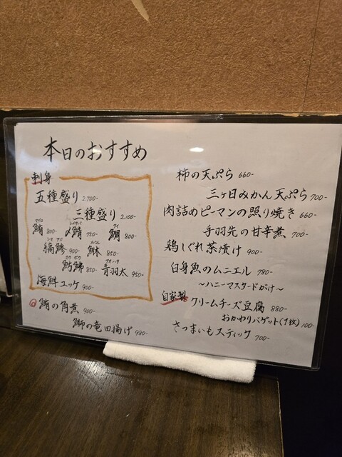 料理も非常にレベルが高く、この日は本日のおすすめを中心に注文。刺身5種盛り(2,700円)は、マグロや〆鯖といった定番に加え、アオハタ、シマアジ、メバルなど刺身では珍しい高級魚も楽しめる内容で鮮度も抜群。三ヶ日みかんの天ぷら(700円)は、甘過ぎず爽やかな風味で食感も楽しく、お酒の良いアテになりました。肉詰めピーマンの照焼き(660円)は照焼きダレが秀逸で、しんなりしたピーマンに味がしっかり染みて美味しい。だし巻き玉子(700円)は出汁がじゅわっと広がる優しい味わいでした。